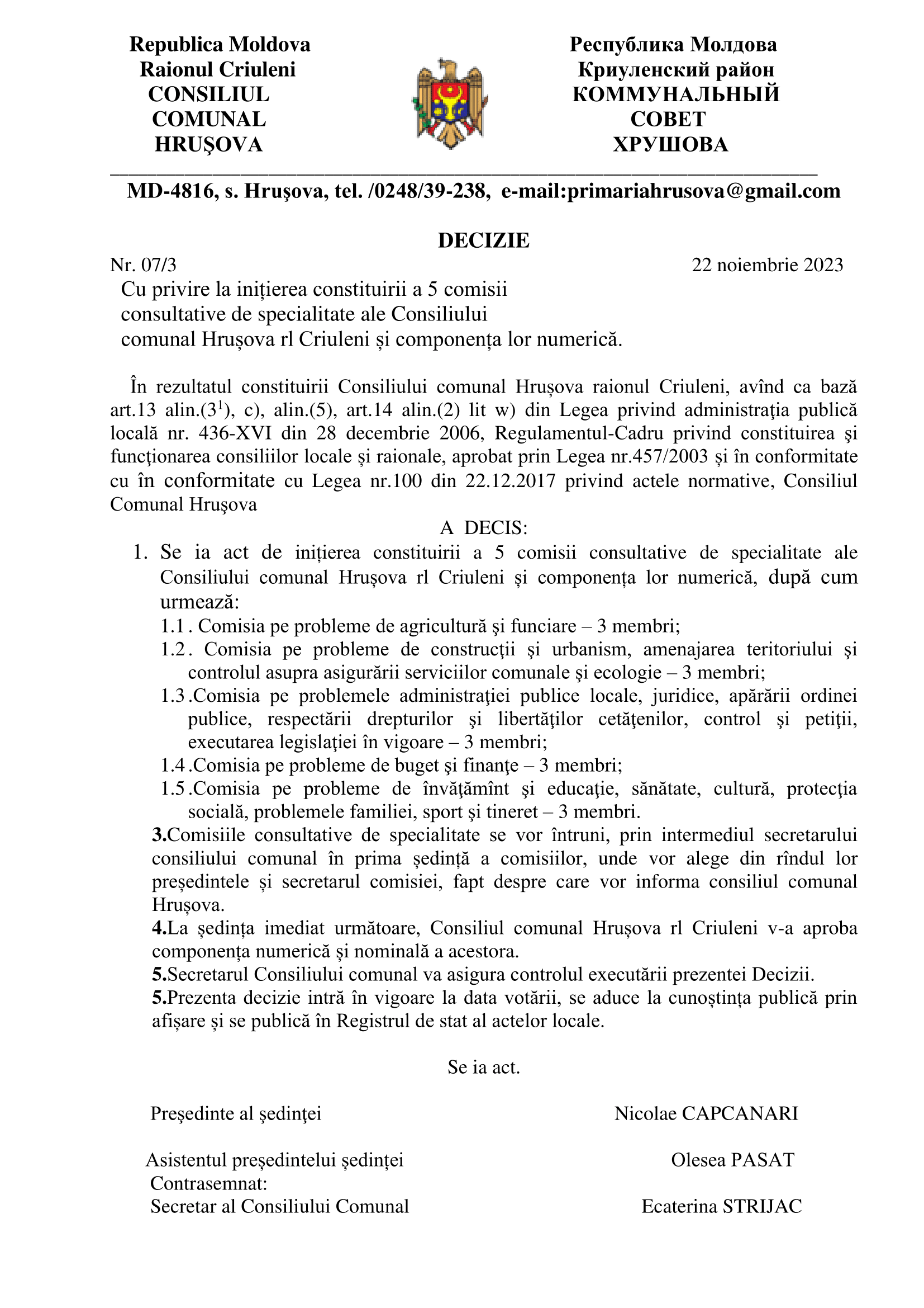 Anunț Cu privire la inițierea constituirii a 5 comisii consultative de specialitate ale Consiliului comunal Hrușova rl Criuleni și componența lor numerică